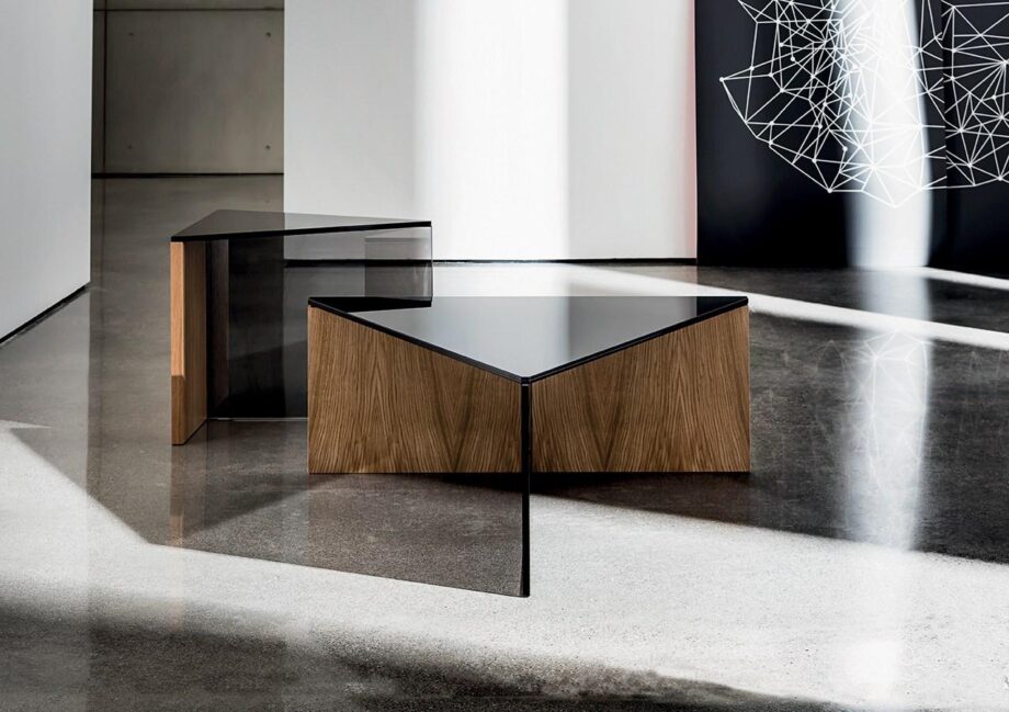Enhance your living space with the sleek and contemporary design of the Regolo coffee table collection. Crafted by the renowned designers Lievore Altherr Molina, these triangular coffee tables exude modern elegance and sophistication. Available in a variety of finishes, including dark overlaid glass and wood, the Regolo coffee table is a versatile piece that can complement any interior decor style.
