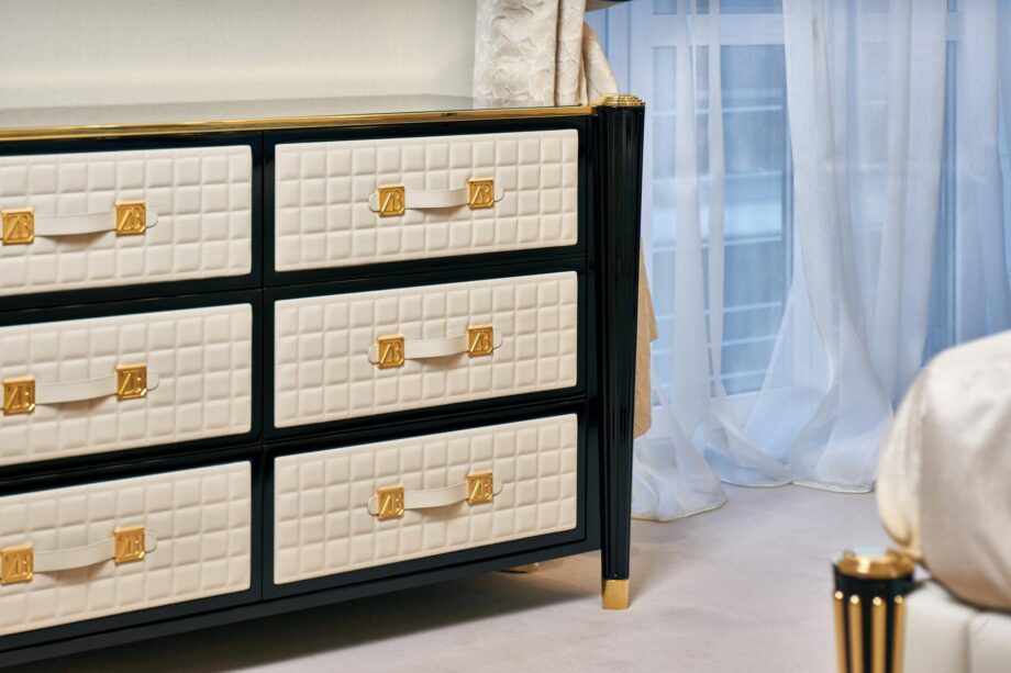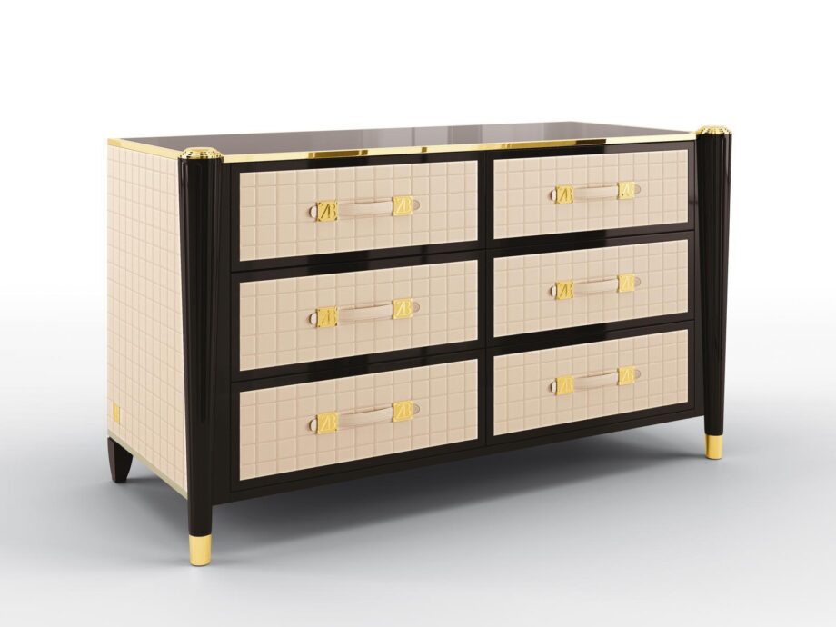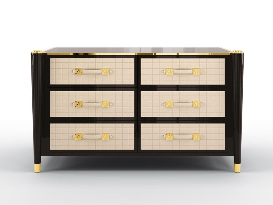 The Remington chest of drawers is a part of our Remington Collection, a line that embodies a refined, modern aesthetic. The chest of drawers boasts a solid wood, plywood, and MDF structure that ensures durability and longevity. A lacquered wooden top adds a touch of sheen to the piece, enhancing its overall elegant appeal. The side parts and drawers are clad in quilted leather, creating an irresistible allure and a soft, tactile experience.