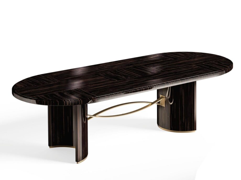 The Richmond Upon Thames table features a unique design that combines modern aesthetics with a retro flair. Its oval shape and statement volumes create a distinctive look that will instantly elevate any room. The use of fine woods, such as rosewood and briarwood, adds a touch of warmth and richness to the design.