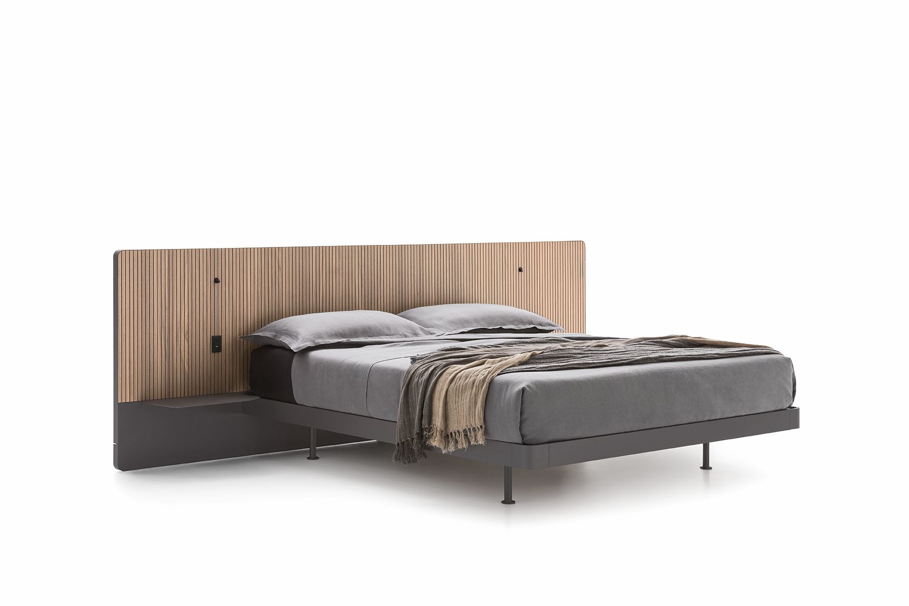 The Righetto bed by Bruna Vaccher is the epitome of modern design and functionality, crafted for those who appreciate minimalism and thoughtful details. This elegant bed immediately captivates with its wooden headboard, enhanced by a graceful aluminum profile. The headboard’s uniqueness is highlighted by two different finishes, one of which harmoniously matches the platform, creating a cohesive and complete look.