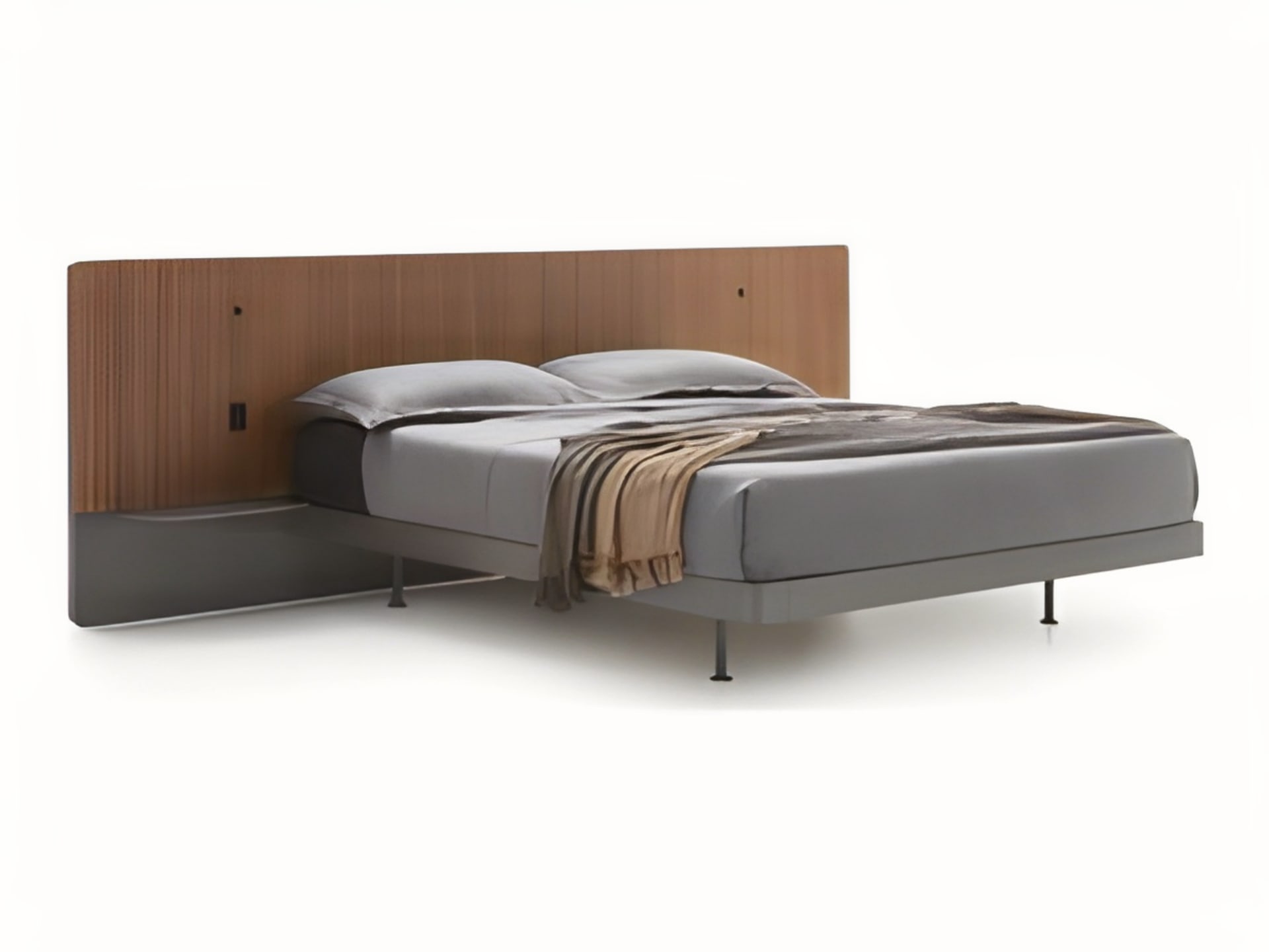Special attention in the Righetto design has been paid to practicality. The headboard can be fitted with an integrated spotlight, providing soft and directed illumination for reading or creating a cozy ambiance. A metal shelf, also integrated into the headboard, offers a convenient spot for books, gadgets, or decorative items, eliminating the need for bedside tables. The bed’s platform is made of wood and rests on stylish metal feet, lending the structure a sense of lightness and airiness.