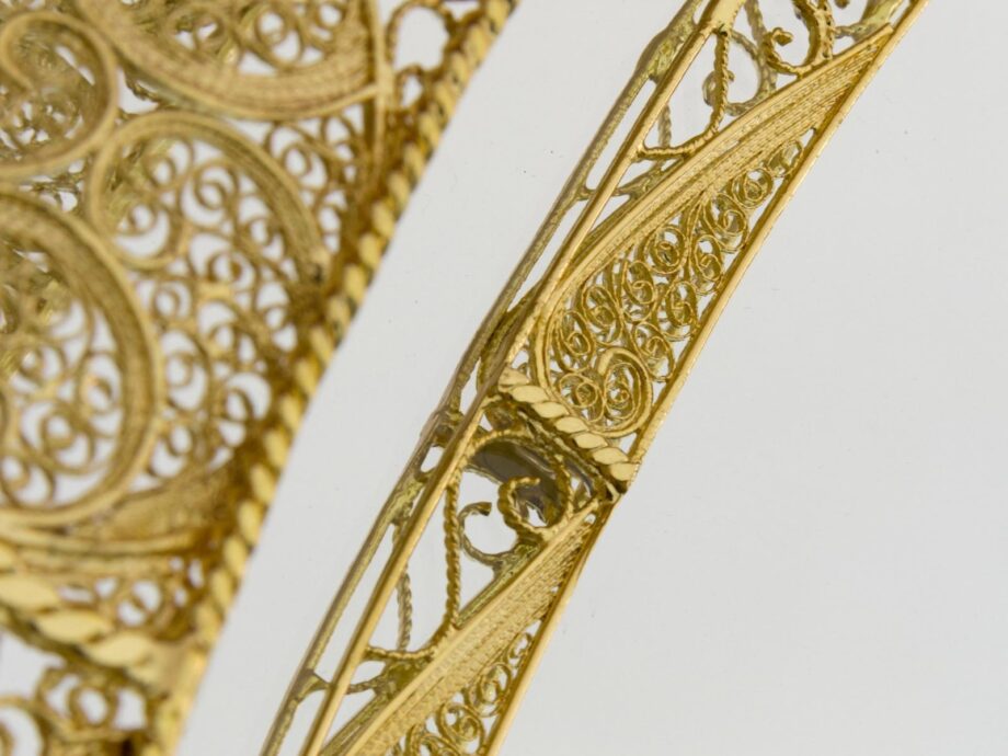 The Ring Filigree is a large, round mirror, framed in resplendent brass. The frame, inspired by the ancient and opulent jewelry making technique known as Filigree, is handcrafted with intricate, artistic motifs. Each brass cord is meticulously shaped and gilded in 18k gold, creating a stunning visual that commands attention.