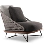 The Rivera Outdoor Sofa Collection includes a two-seat sofa and a three-seat sofa, armchairs, an ottoman, a coffee table, and a chair. Each piece is a statement of retro elegance interpreted in a contemporary language. The innovative use of materials evokes sensations reminiscent of relaxing by a lakeside veranda or a terrace overlooking the sea.