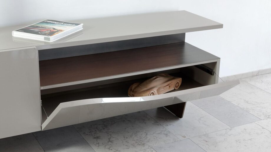 The open segment of the sideboard is customizable in various finishes, including carved lacquered glass, Canaletto Walnut, smoked mirror, or silk Brass and Titanium finishes, allowing you to personalize your space to reflect your unique taste. Additionally, the Segno sideboard can be equipped with an optional LED lighting system, adding a touch of warmth and ambiance to your room.
