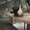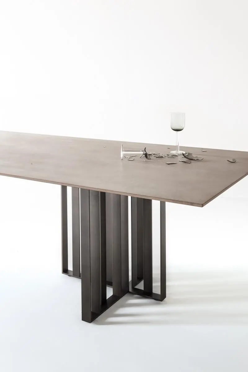The sculptural base of the Shade table features intricately arranged sheets of treated metal that create a dynamic play of light and shadows, earning it its name. The tabletop is available in a variety of materials and finishes, allowing you to customize the look to suit your style. Whether you choose a ceramic or wooden finish, the beauty and elegance of this piece shine through.