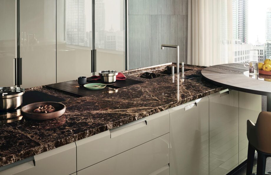 Elevate your kitchen space with the exquisite Shape kitchen design from Italy. This modern marvel combines sleek metal, warm wood, and luxurious natural stone to create a stunning masterpiece that will transform your home. The striking marble color adds a touch of elegance and sophistication to any kitchen decor.