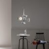 The Sibilla features a unique configuration of vertical and horizontal arms that hold conical shades, creating a geometrically captivating design that emits light in all directions. This innovative suspension lamp is a true statement piece that draws the eye and adds a touch of contemporary flair to any space.