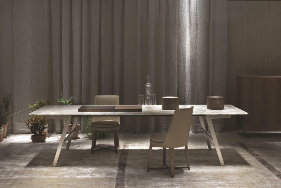 The Soffio table is characterized by its sleek and minimalist silhouette, featuring flat metal legs that create a striking ‘boomerang’ shape. This unique design element adds a touch of dynamism to the space, while also providing a sense of solidity and airiness. The metal base is available in a variety of finishes, including satin, chrome, burnished, black chrome, and champagne, allowing you to customize the look to suit your aesthetic preferences.