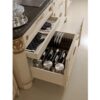 Prominent features include hand-crafted grille on the glass doors and finely curved details on the end column. The backs of the glass cabinets are adorned with Rubelli’s Les Indes Galantes fabric in pearly white, dramatically enhanced by LED lighting placed inside each cabinet. The exhaust hood, characterised by soft, curved lines, is embellished with hand-carved motifs, adding a touch of old-world charm to your contemporary kitchen space.