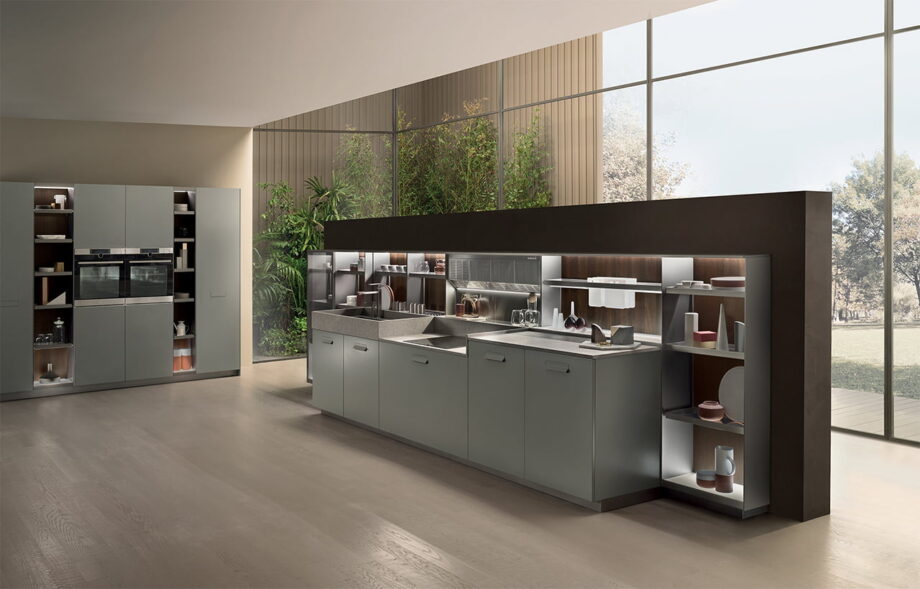 Add a touch of elegance to your kitchen with the Medley system equipment, a versatile shelving system that seamlessly integrates with your living area. The In-Line Wall Unit showcases innovative design with a concealed opening and closing system, creating a sleek and seamless look for your space.