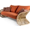 The Stankar collection features a unique suspended seat design, with rope components attached to a metal frame that wraps around the backrest, creating a distinctive curvilinear profile. Inspired by espadrilles footwear, the natural hemp and Lurex strings used in the design add a touch of sophistication to your outdoor setting.