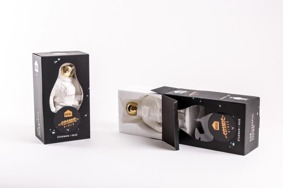 The Starman vase is available in a stunning gold finish, adding a touch of elegance and sophistication to any space. Its visionary design is inspired by the universe, making it a captivating addition to your home decor. The Cosmic Diner collection features plates with enchanting images and cutlery and accessories with bronze finishes, all reflecting the beauty of space and space missions.