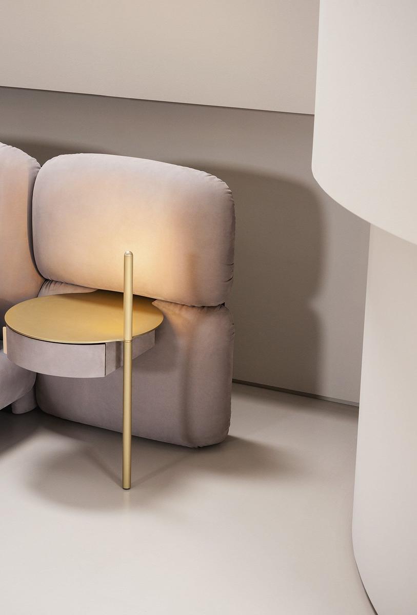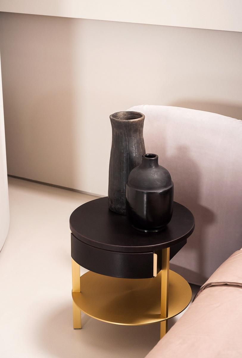 Whether you choose the version with a fixed headboard or the modular option, STONE is sure to elevate your bedroom decor. The freestanding night table, available with or without a drawer, features a striking design with a leather top and satin brass-coated metal structure. The drawer, with a canaletto walnut veneered internal structure, offers storage space with a touch of sophistication.