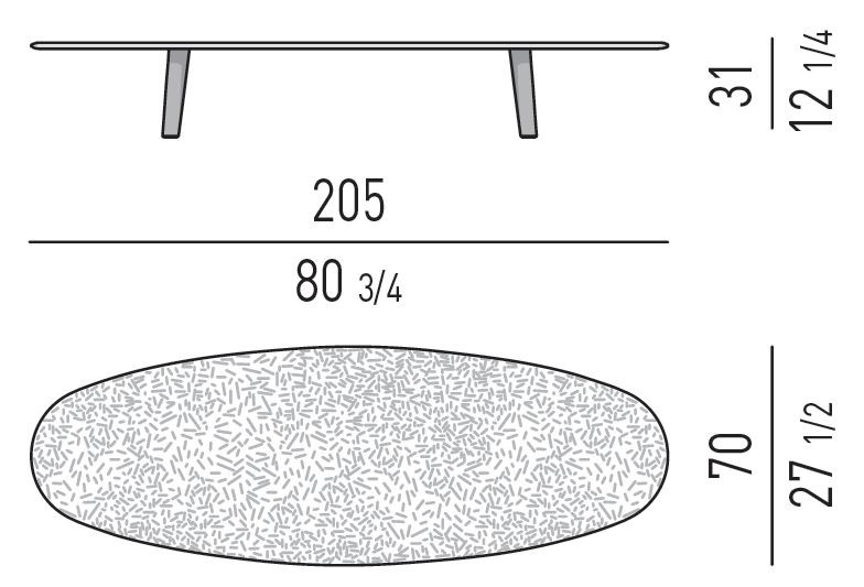 The distinct elongated oval shape offers a Silver Beola stone top exhibiting beveled edges, emulating the feel of a river rock, truly a remarkable tactile and visual experience. Each top surface is elegantly finished with an exclusive Pewter color meticulously conceived by Minotti Studio, which reflects the color of the die-cast aluminum legs, adding a touch of individuality to the overall ambiance of the piece.