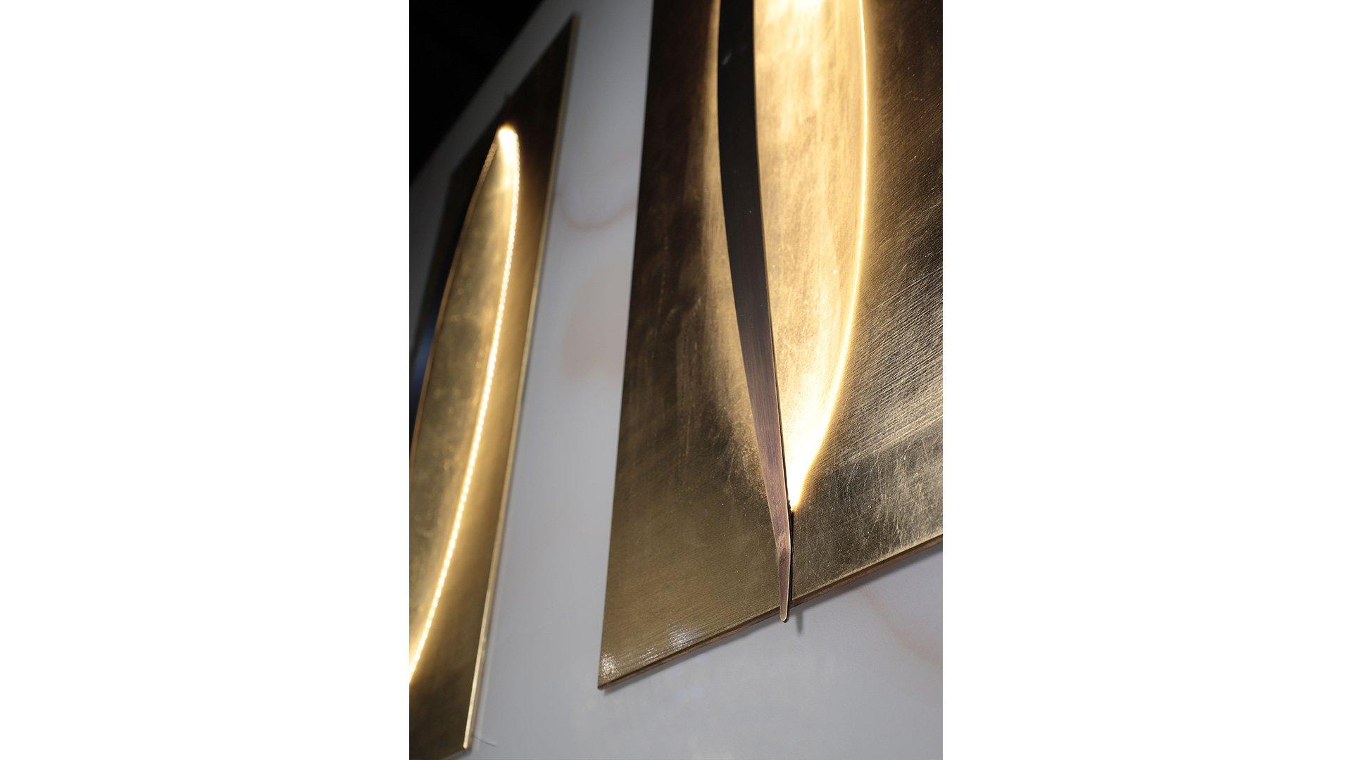 The Terra wall lamp features a sleek design with a 5mm thick glass in a luxurious gold leaf finish, adding a touch of glamour to any room. The metal casing in a polished finish complements the overall look, while the vertical bar houses an LED strip that emits a warm and inviting glow (9.6W 12V 2700-3000K).