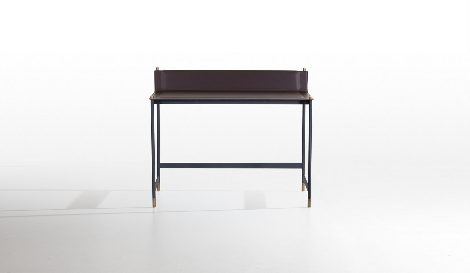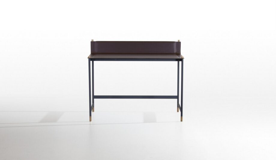 The Terrazzo desk features a powder-coated rounded steel structure with elegant tapered legs and barrel-shaped accents in a rich tanned metal finish. The desk’s top and shoulders are crafted from slim plates with a plush polyurethane foam cushion insert, covered in supple hide leather that has been expertly refined with visible edge stitching for a polished look.