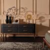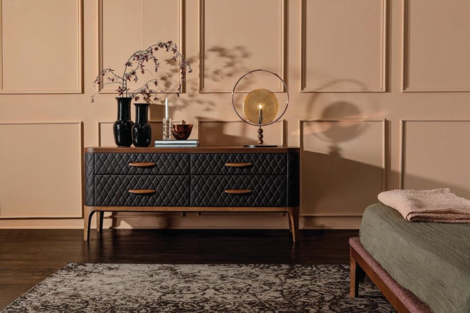 The exquisite combination of leather and wood in the construction of this sideboard creates a harmonious blend of textures that will enhance any interior space. The padded structure and rhombus-patterned upholstery add a touch of luxury to the design, making it a standout piece in your bedroom decor.