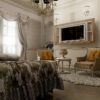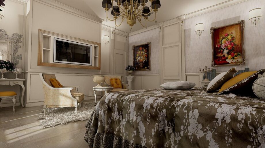 Complementing the bed are two classic style bedside tables, providing a perfect balance of aesthetics and functionality. A suspended TV unit brings a modern touch to the classic style, making this bedroom set a perfect blend of the old and the new.