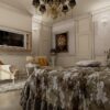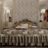 The Tosca bedroom set features a grand bed as the centerpiece, boasting a beautifully shaped headboard that stands imposingly against a backdrop of exquisite lacquered wood panelling. The addition of mirrors and padded velvet exudes a sense of opulence, enhancing the overall appeal of the bedroom.