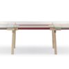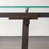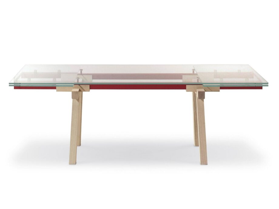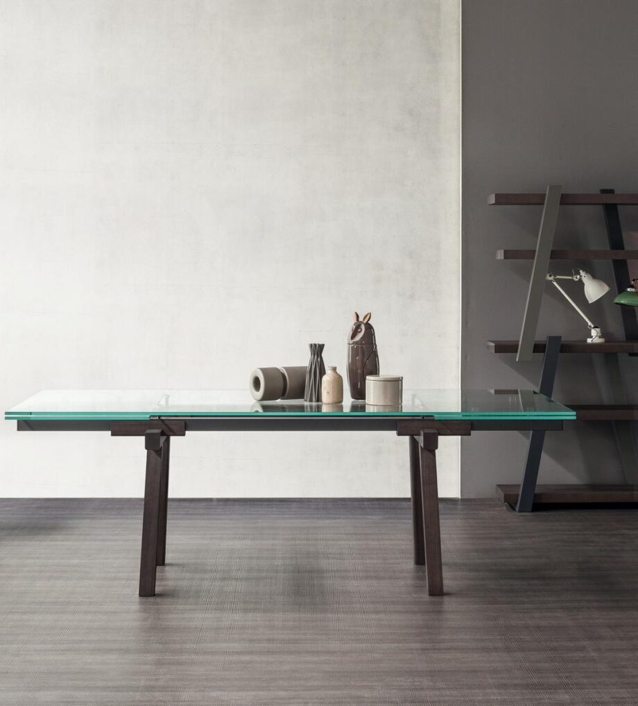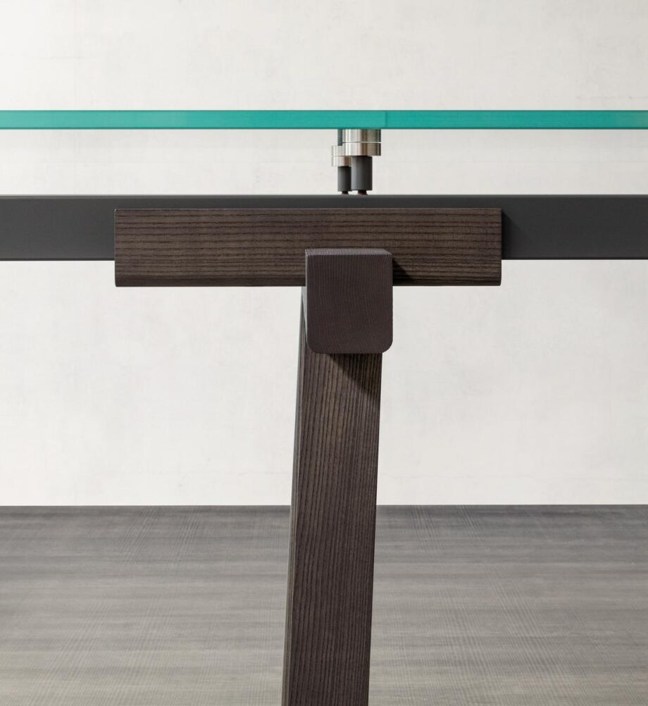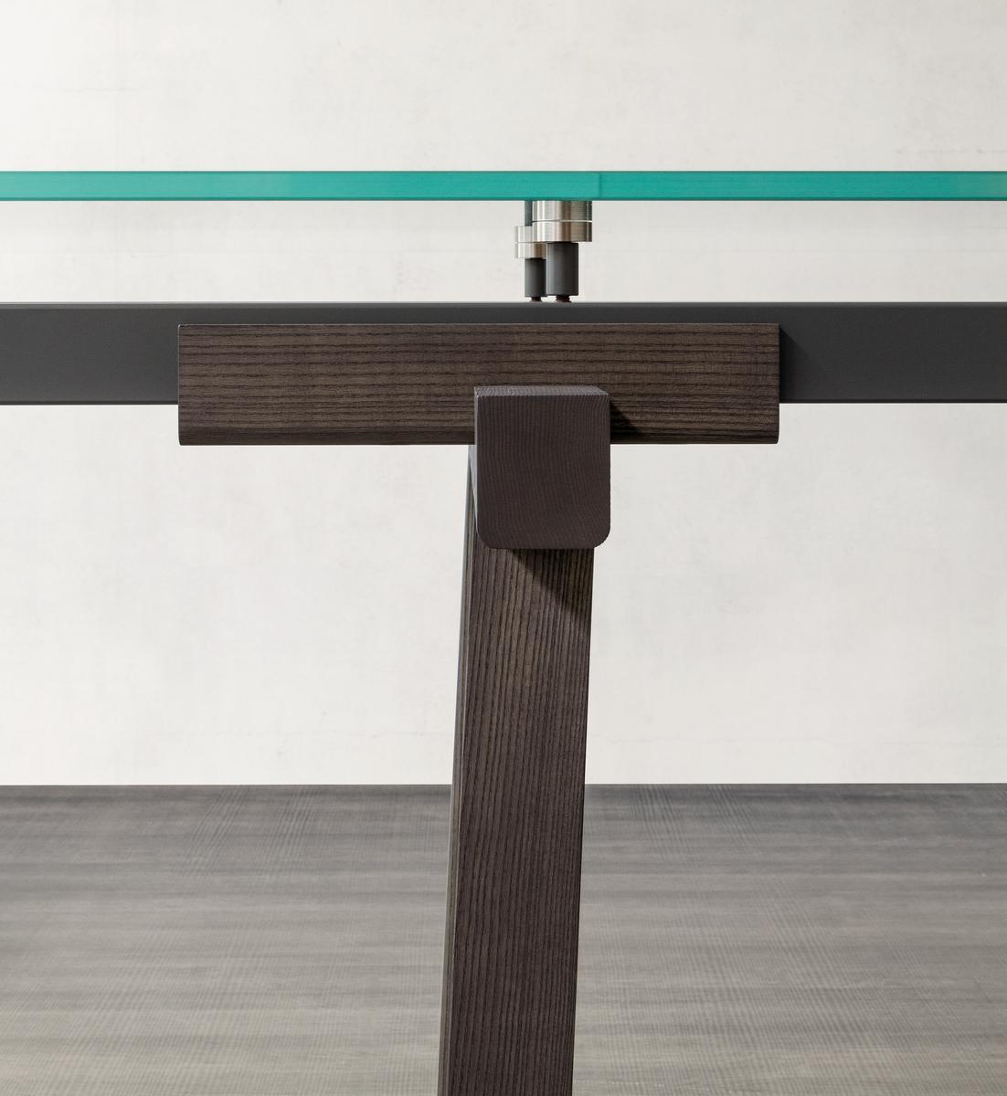 The glass table top, available in transparent, extra-light transparent and smoked black, complements the frame perfectly. The wooden legs, made from ash-wood (natural or brushed anthracite grey) or American walnut-wood, add a touch of natural charm to the overall modern design.