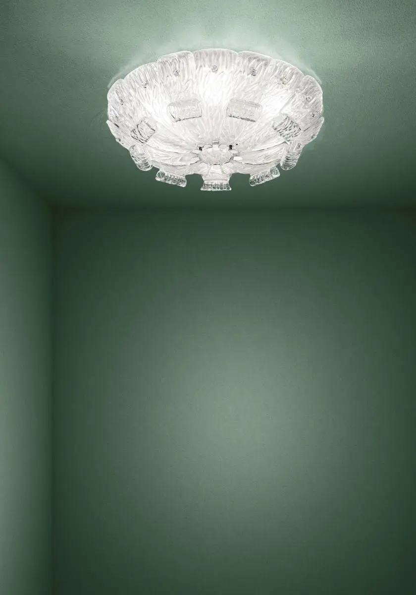 Available in various sizes and configurations, including 3, 5, 6, 12, 20, and 40 light options, the Tribuno ceiling light offers a versatile lighting solution for any room. The intricate relief design on the glass surface, achieved through the ‘a caldo’ technique, adds a touch of luxury and charm to your space.
