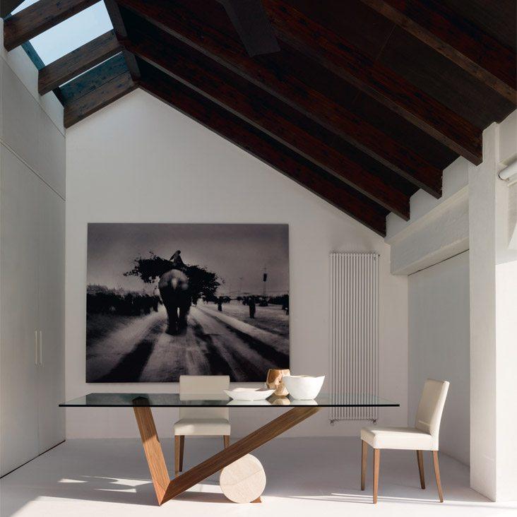 Constructed with premium materials such as tempered glass, wood, and natural stone, the Valentino table exudes elegance and durability. The base of the table showcases a central leg with a wood insert and a marble cylinder available in white, black, or travertine options. With choices for rectangular, oval, or beveled glass tops, you have the freedom to customize this table to fit your space perfectly.