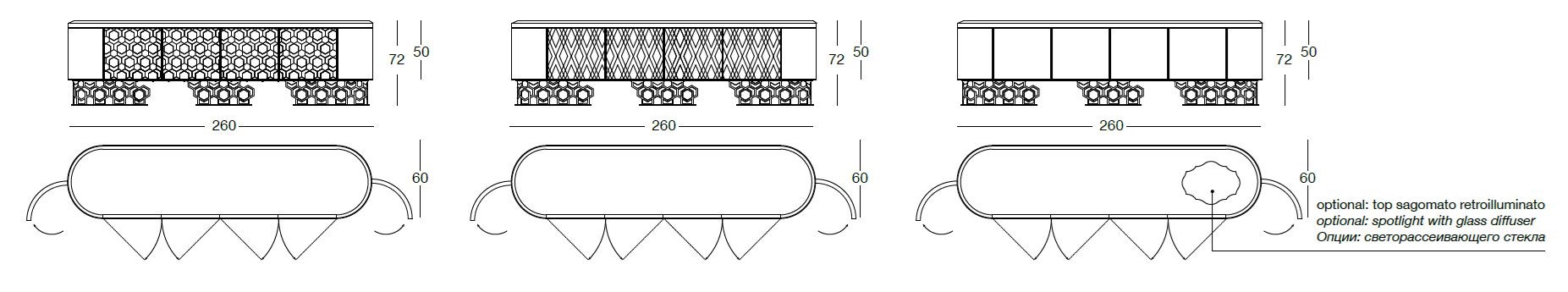 The intricate 3D covering of the doors with Diamond or Sequence decoration in relief is a testament to the meticulous craftsmanship of the Loveluxe collection. The shelf finishes include bronze or smoky mirror with a beveled edge, as well as a selection of luxurious marble options.