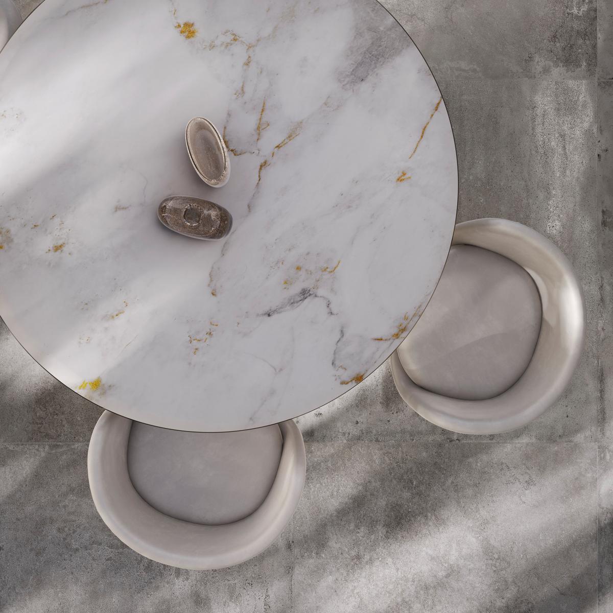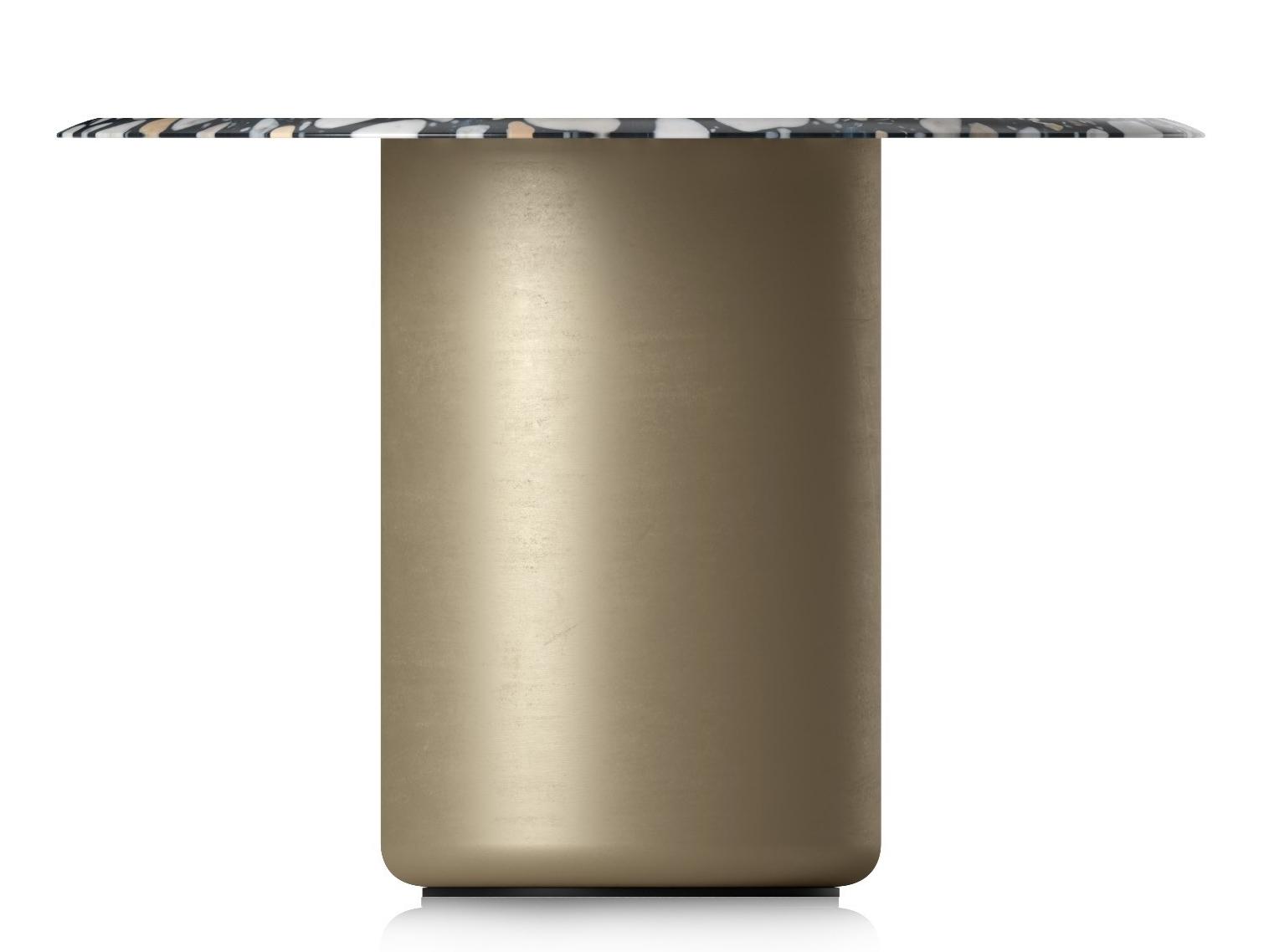 Crafted with monolithic steel pedestals in a lustrous light gold satin finish, the Voyage table exudes luxury and charm. The combination of precious tops in various materials adds a touch of opulence to this piece, elevating your space with its exquisite design.