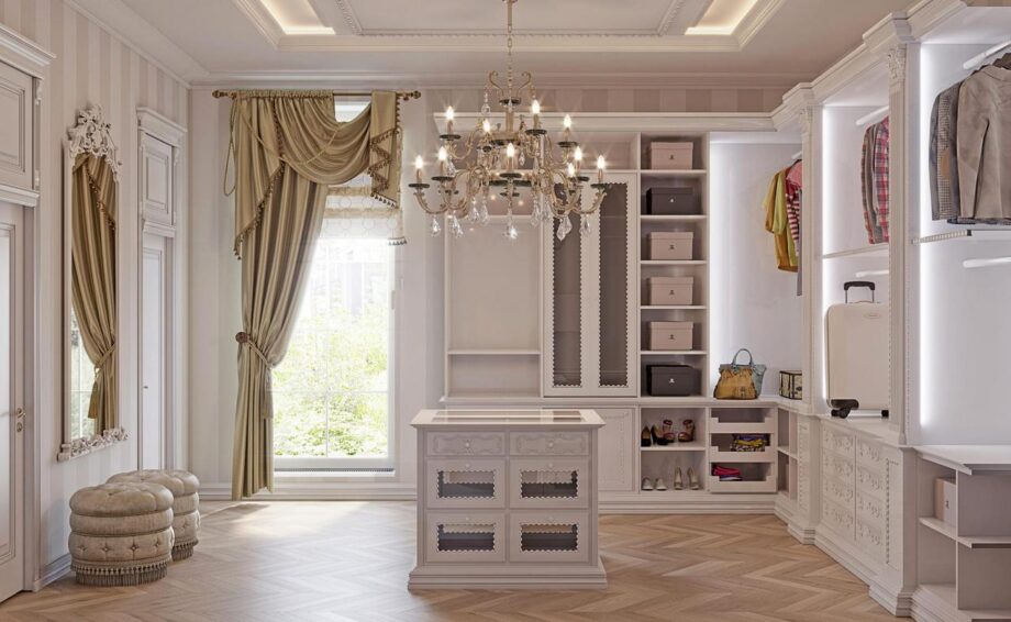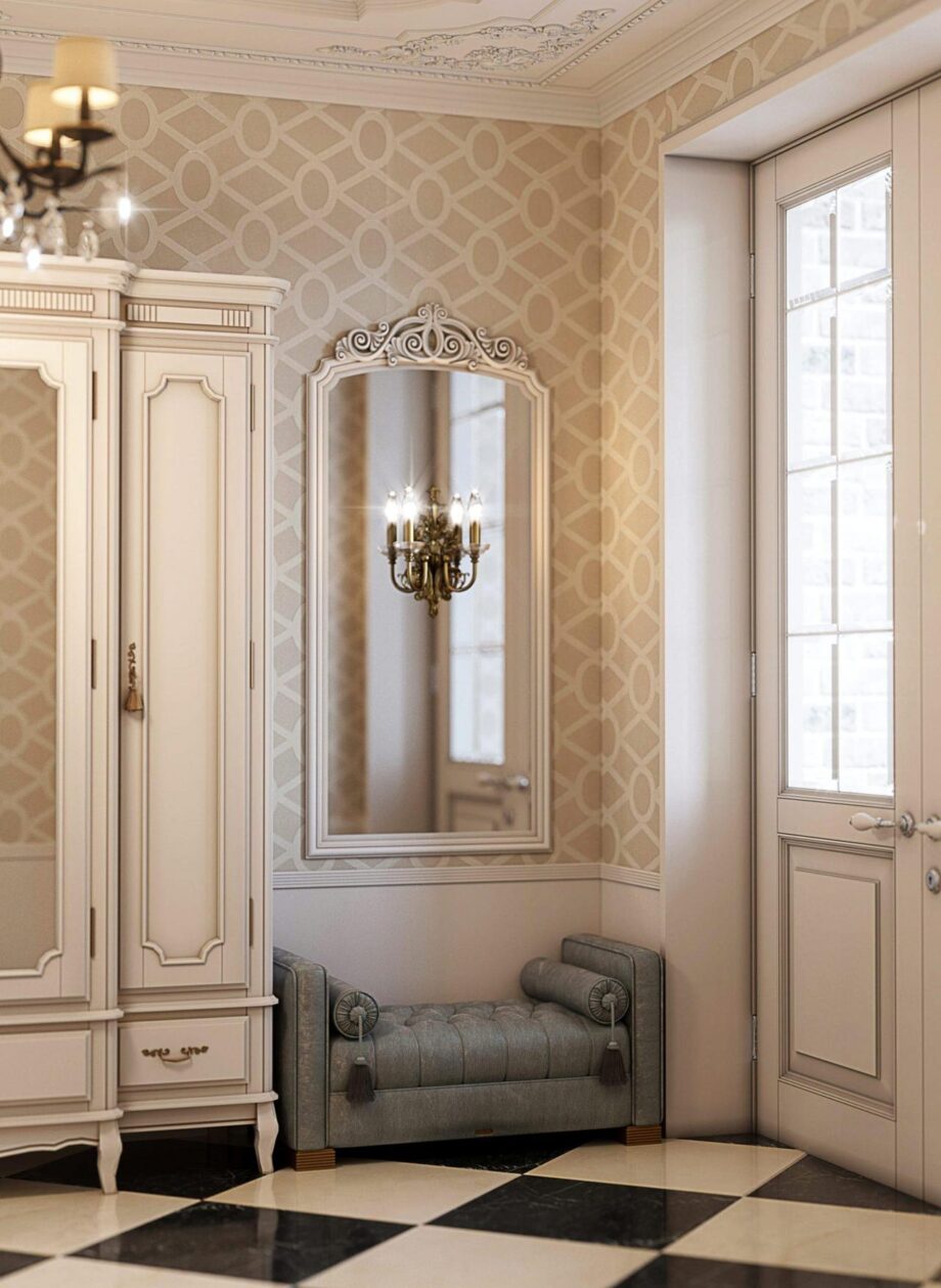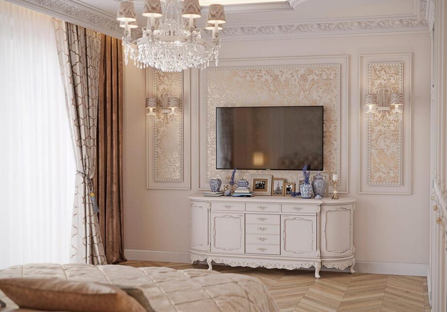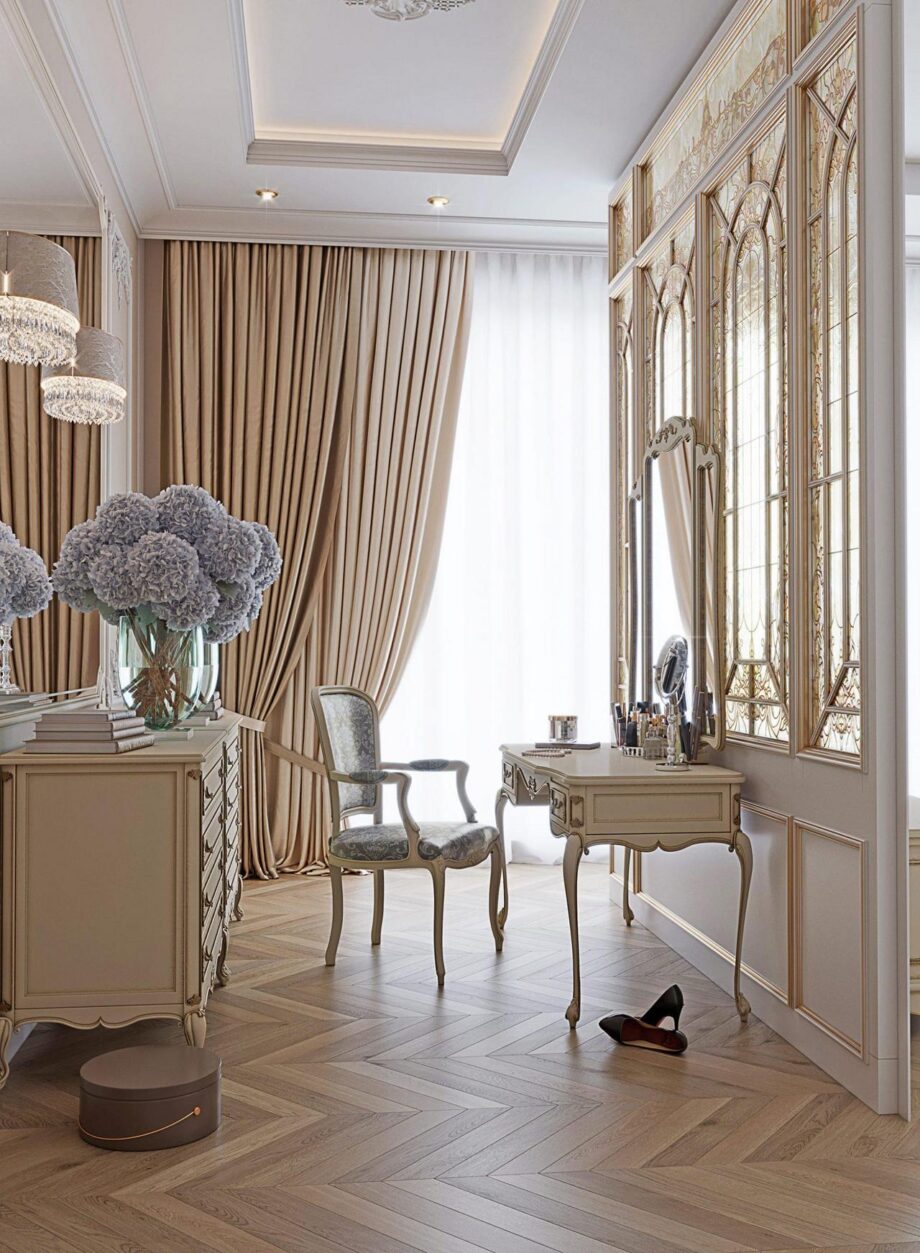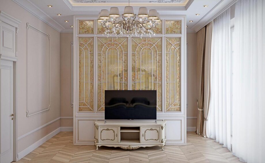 While working on the project, we were guided by the client’s preferences. Inspiration was taken from the luxurious halls of the French Versailles. Thanks to the high ceilings, we were able to use complex plaster stucco, without overwhelming the space. The living room is reminiscent of Marie Antoinette’s boudoir: a high fireplace with marble trim, a velvet sofa and Angelo Cappellini chairs, heavy drapes and a crystal Masiero chandelier.We stand for environmental friendliness and choose only natural materials: natural stone, wood, ceramics. Therefore in the classical interior of the project there is marble, upholstery is made of satin and velvet, and the wooden panels are of precious wood. Natural materials not only provide stunning aesthetics, but also guarantee longevity.In design we have adhered to austere, elegant classics and baroque luxury without technological trends. The unity of these two directions created a truly perfect image.